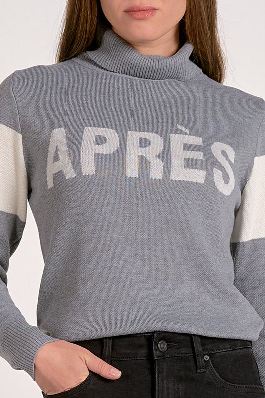 The Apres Sweater brings a playful twist to your cold-weather closet. Featuring bold graphic text and a cozy knit feel, this sleeveless top is perfect for layering under ski jackets or styling with joggers for post-slope lounging.