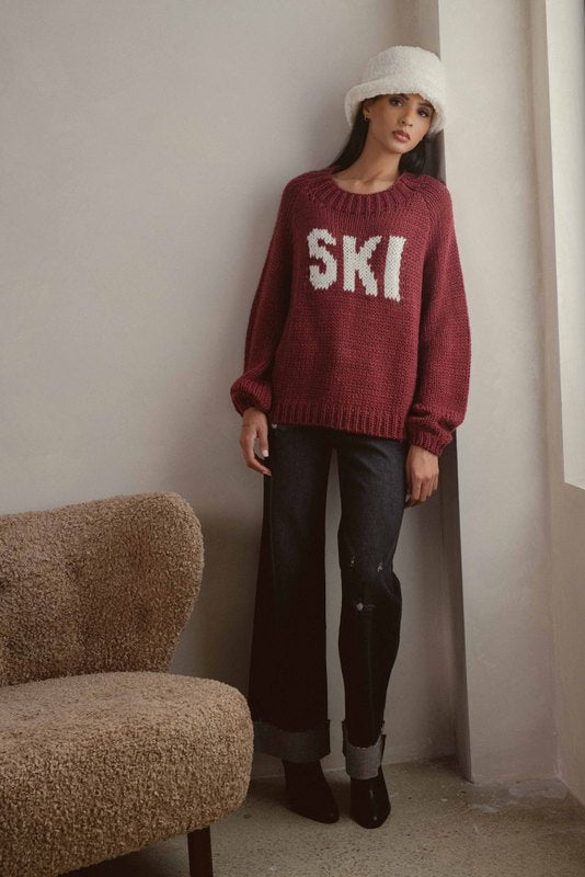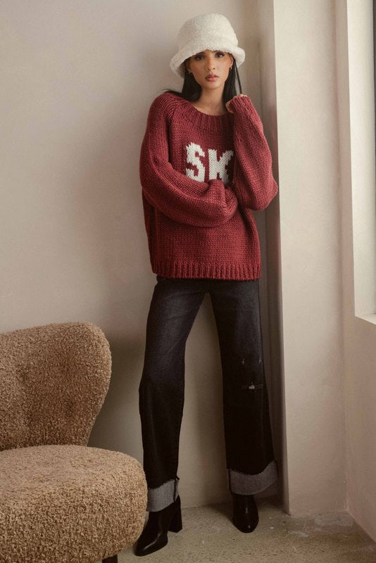 Snuggle into style with the Bunny sweater. 'Ski' text and a slouchy fit capture aprés-ski chic in this chunky knit, perfect for cozy evenings by the fire.