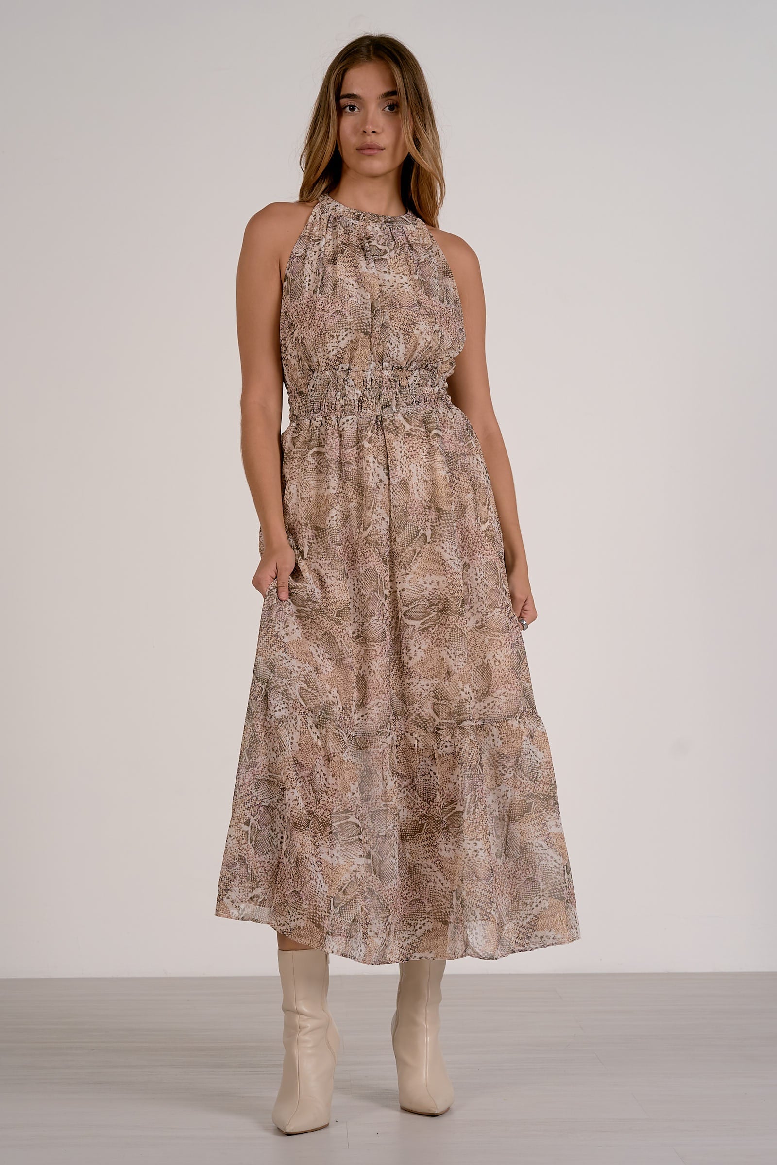 The Cara Dress is a halter-neck maxi that blends striking style with seasonal ease. Crafted from fluid woven fabric in our Natural Snake print, this standout silhouette is perfect for transitional dressing.