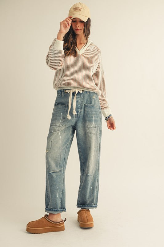 The Harlow Vintage Rope Jean offers a relaxed fit with a unique washed vintage look, featuring a distinctive painted rope string detail and a convenient front pocket. Crafted from 100% cotton, these jeans combine comfort and style, perfect for adding a boutique touch to your casual wardrobe.