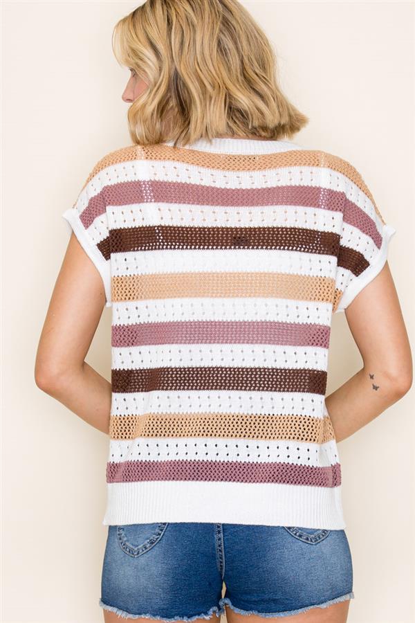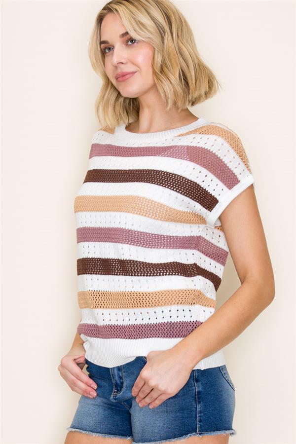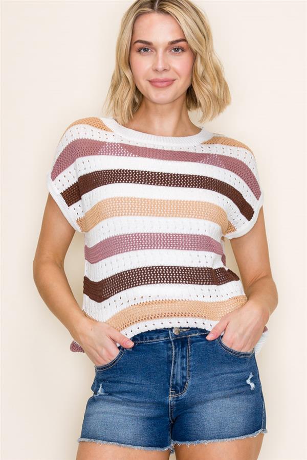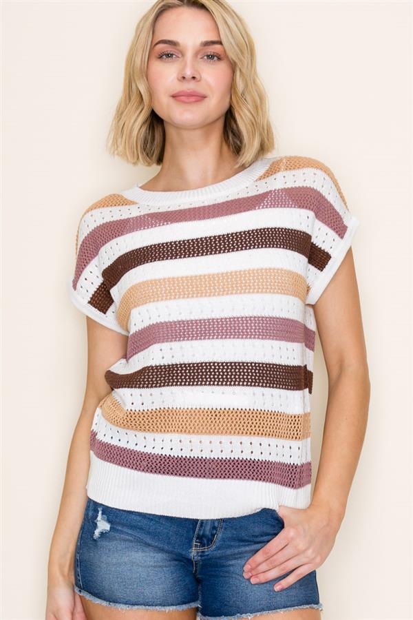 Upgrade your wardrobe with the Made My Way Top! Featuring a multi color block striped design, pointelle details, extended short sleeves, and a comfortable crew neck, this sweater is perfect for any occasion. Stay stylish and warm with this must-have piece!
