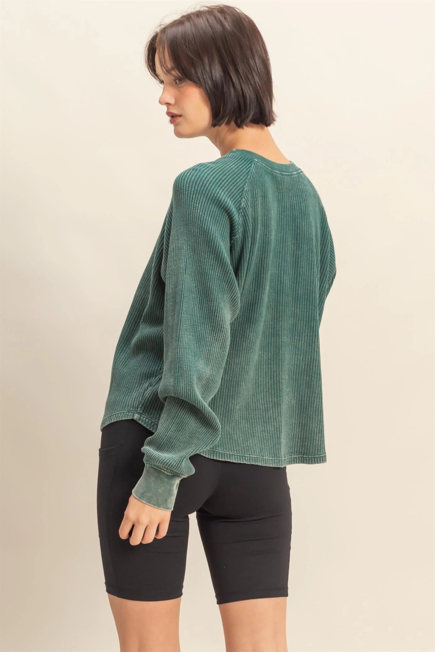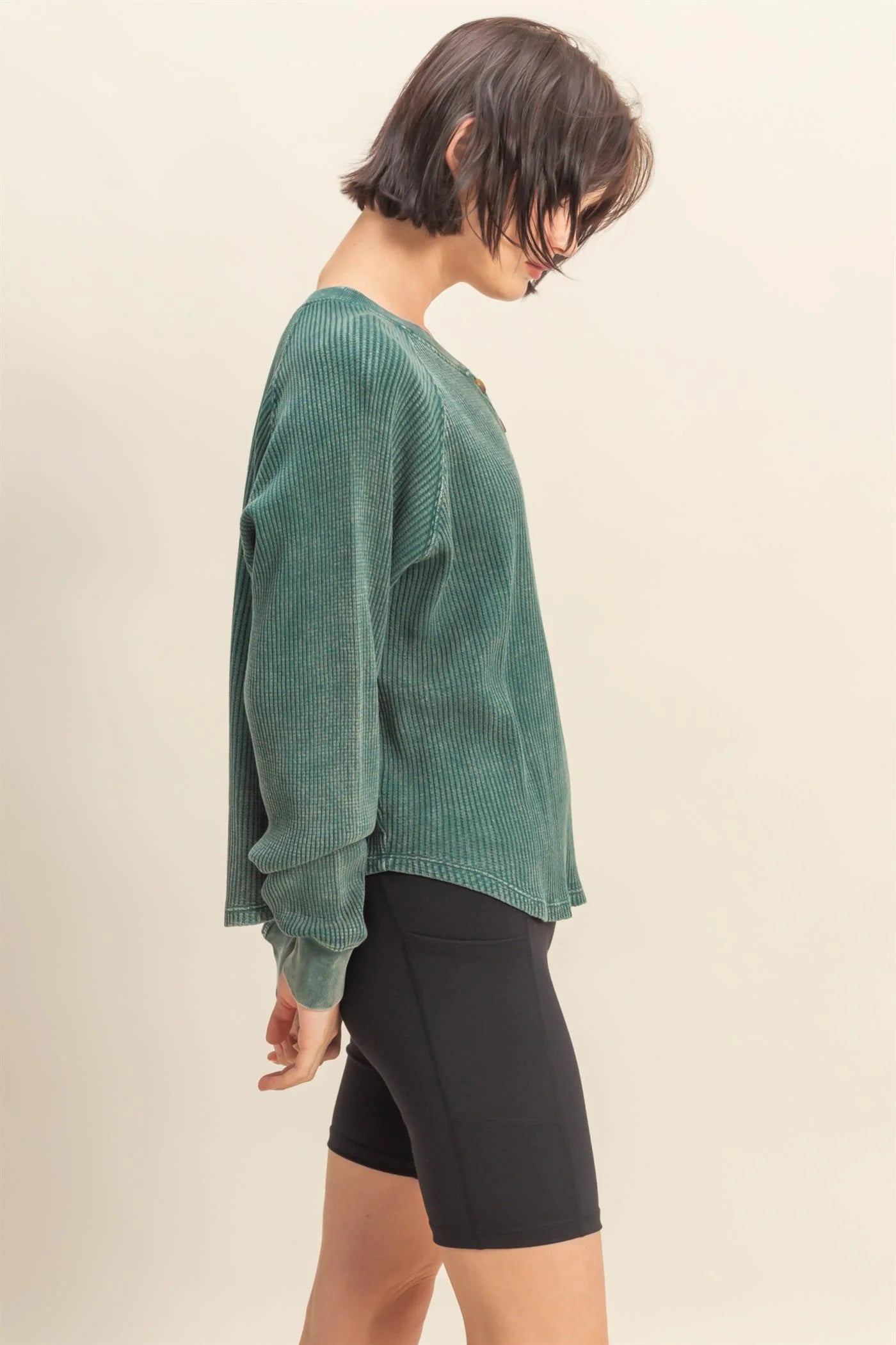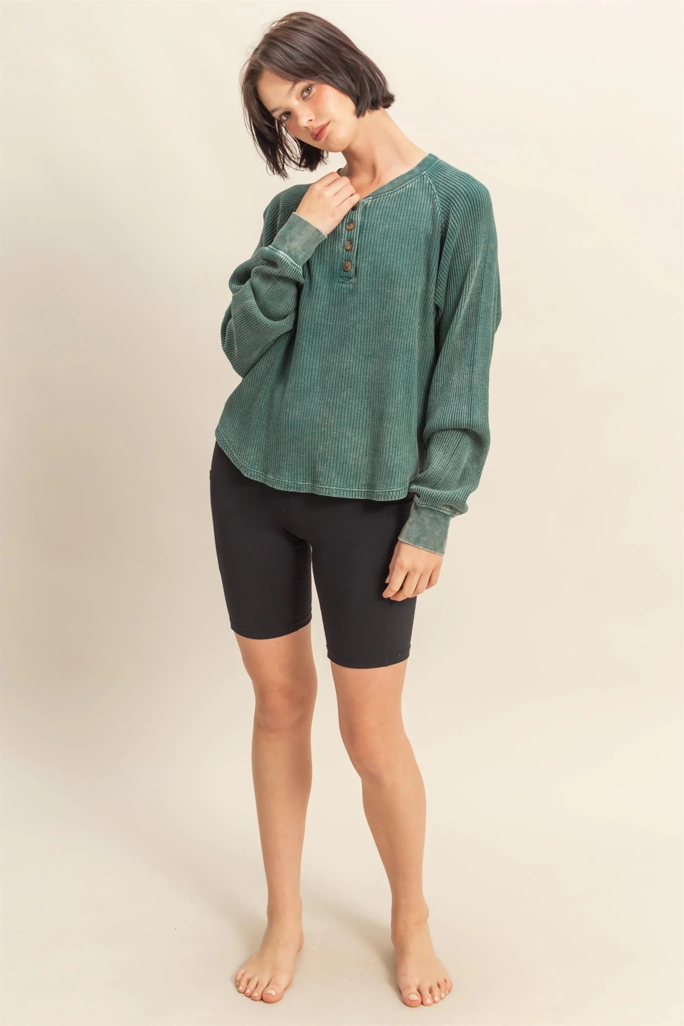 Mineral Washed Henley Waffle Raglan Sleeve Top
