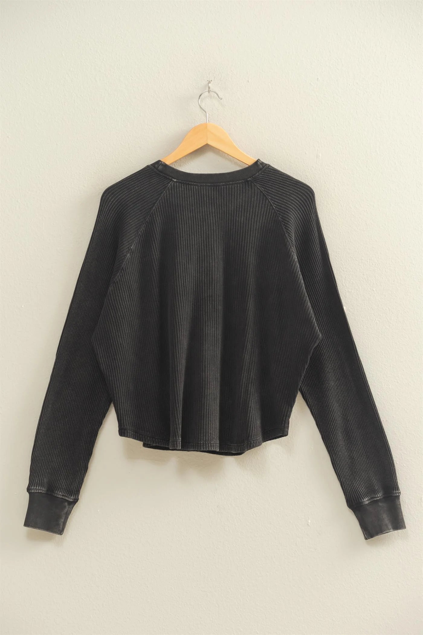 Mineral Washed Henley Waffle Raglan Sleeve Top